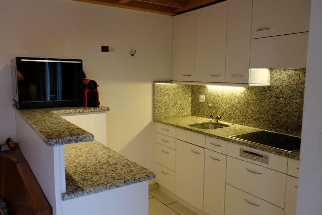 - Wohn- Esszimmer mit offener Küche. Cerankochfeld, Kühlschrank mit Tiefkühlfach, Kaffeemaschine Delicio, Wasserkocher, Fondue- und Racletteset, Microwelle