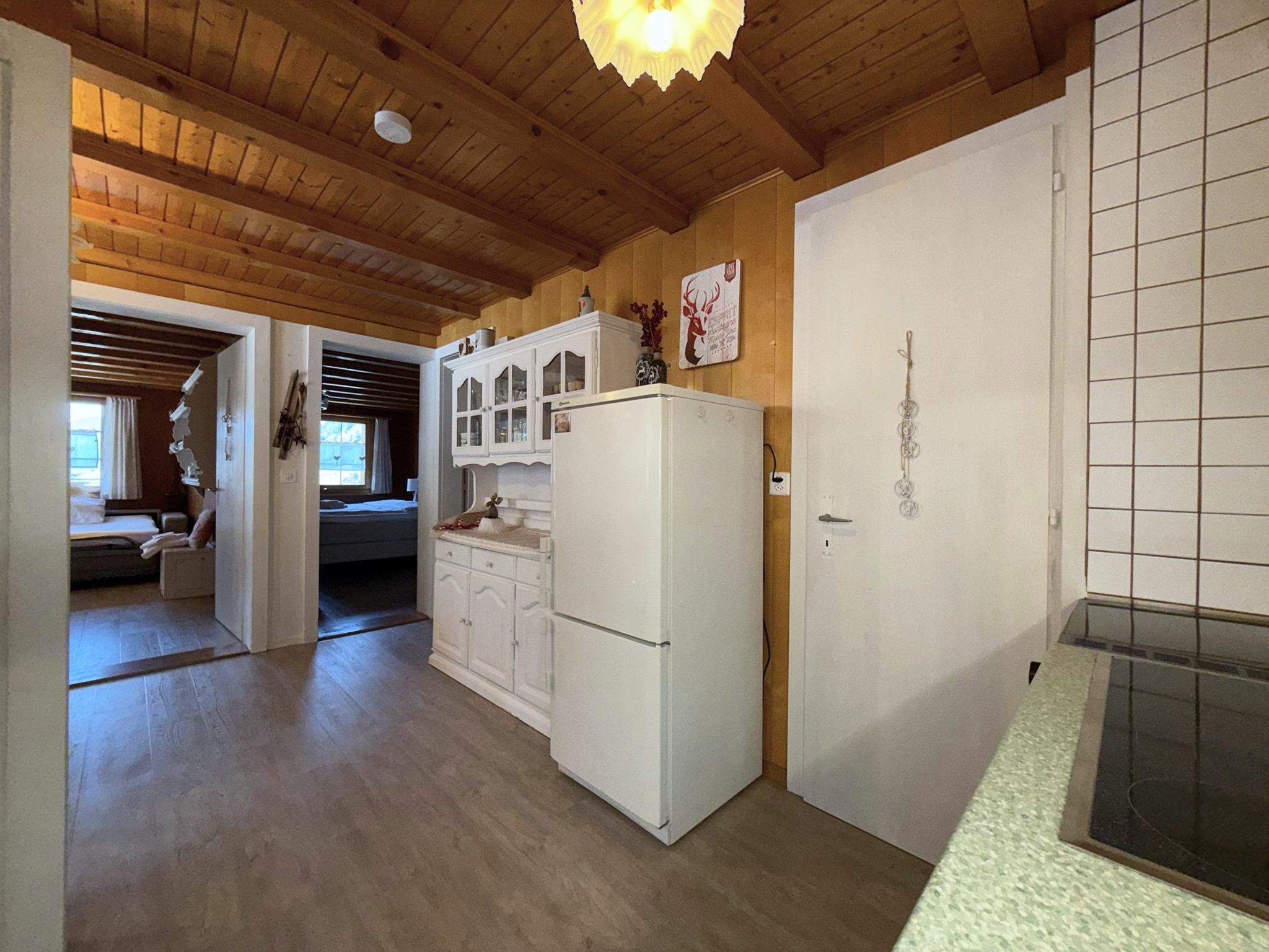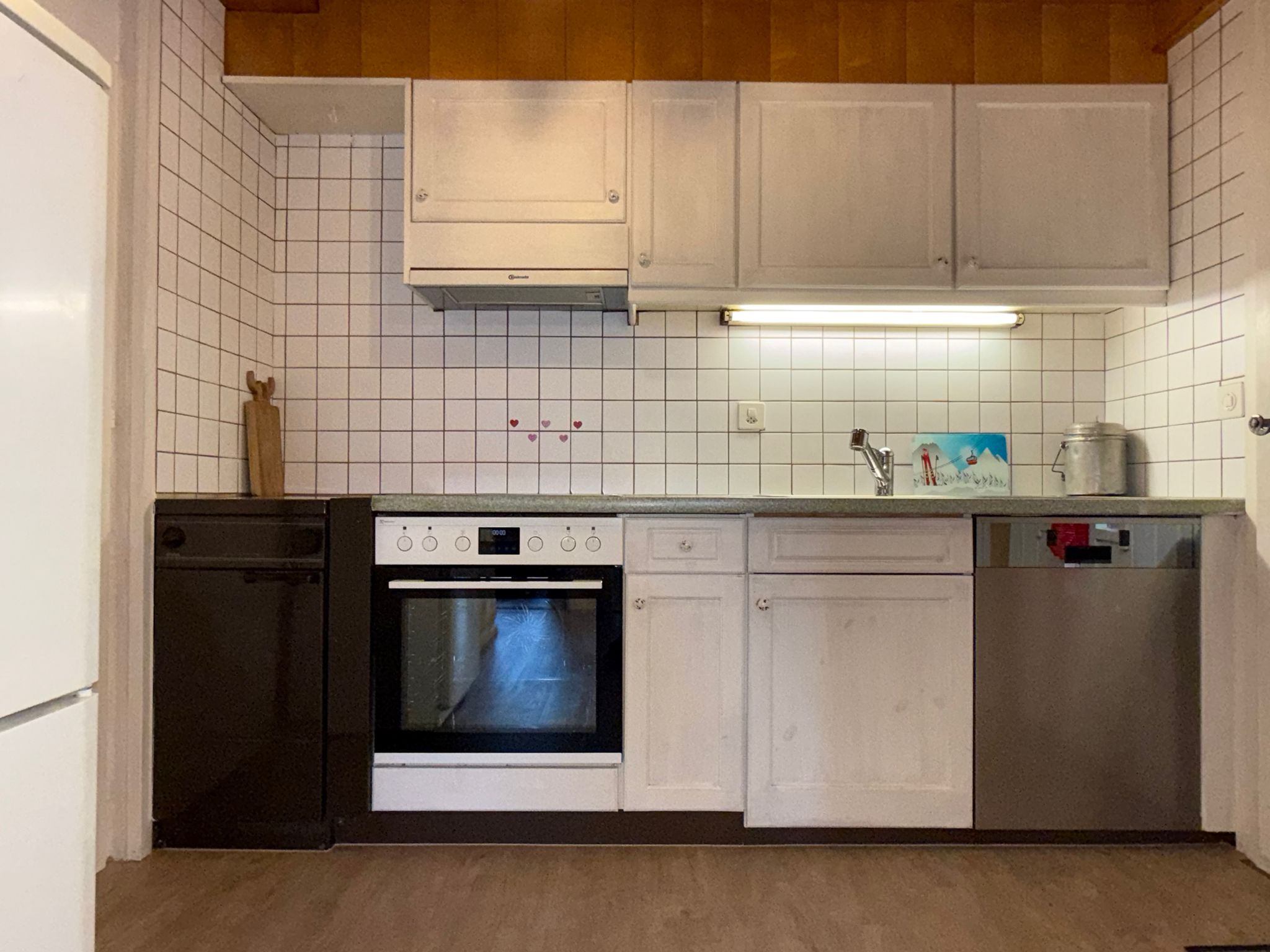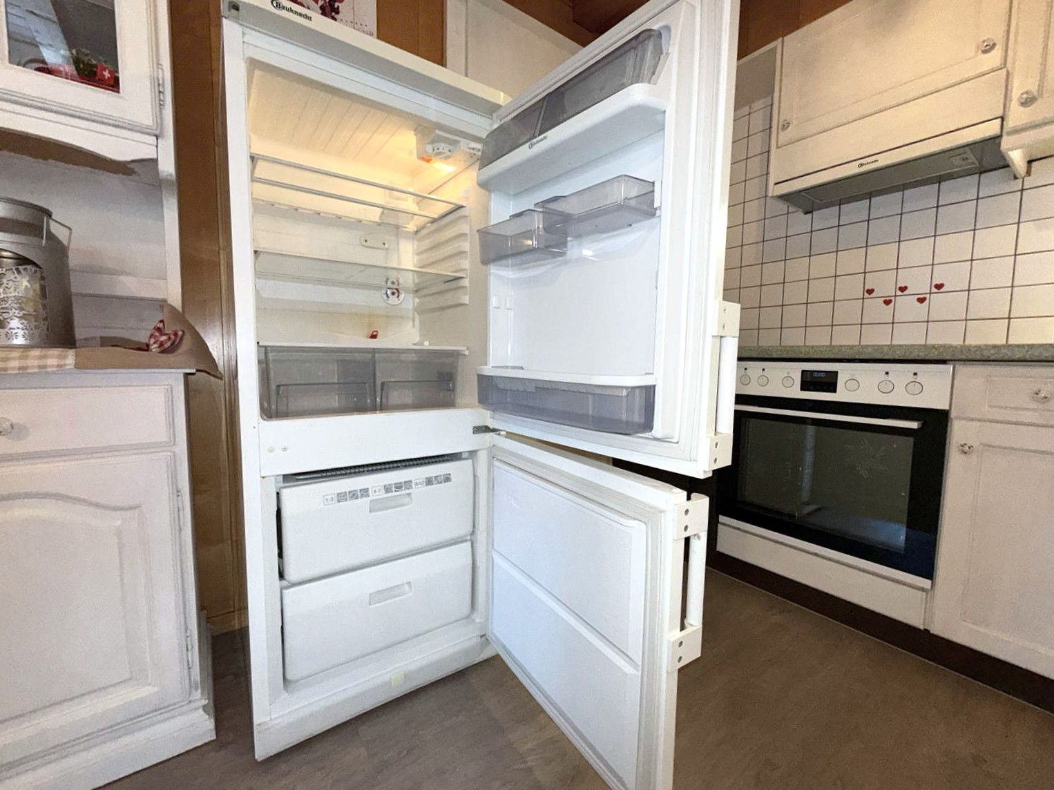 • Küche mit Backofen, Cerankochfeld, Kühlschrank mit Tiefkühlfach, Kaffeemaschine Nespresso, Wasserkocher, Geschirrspüler