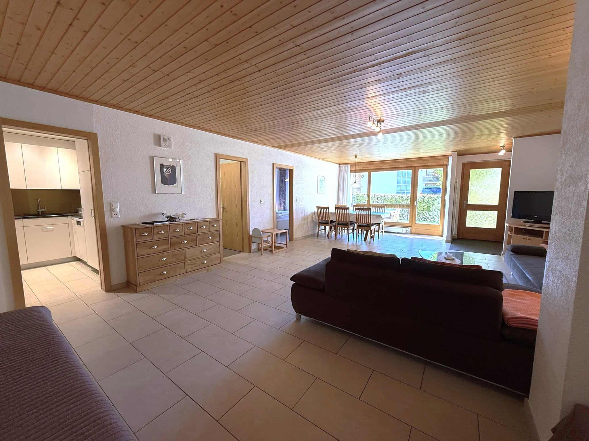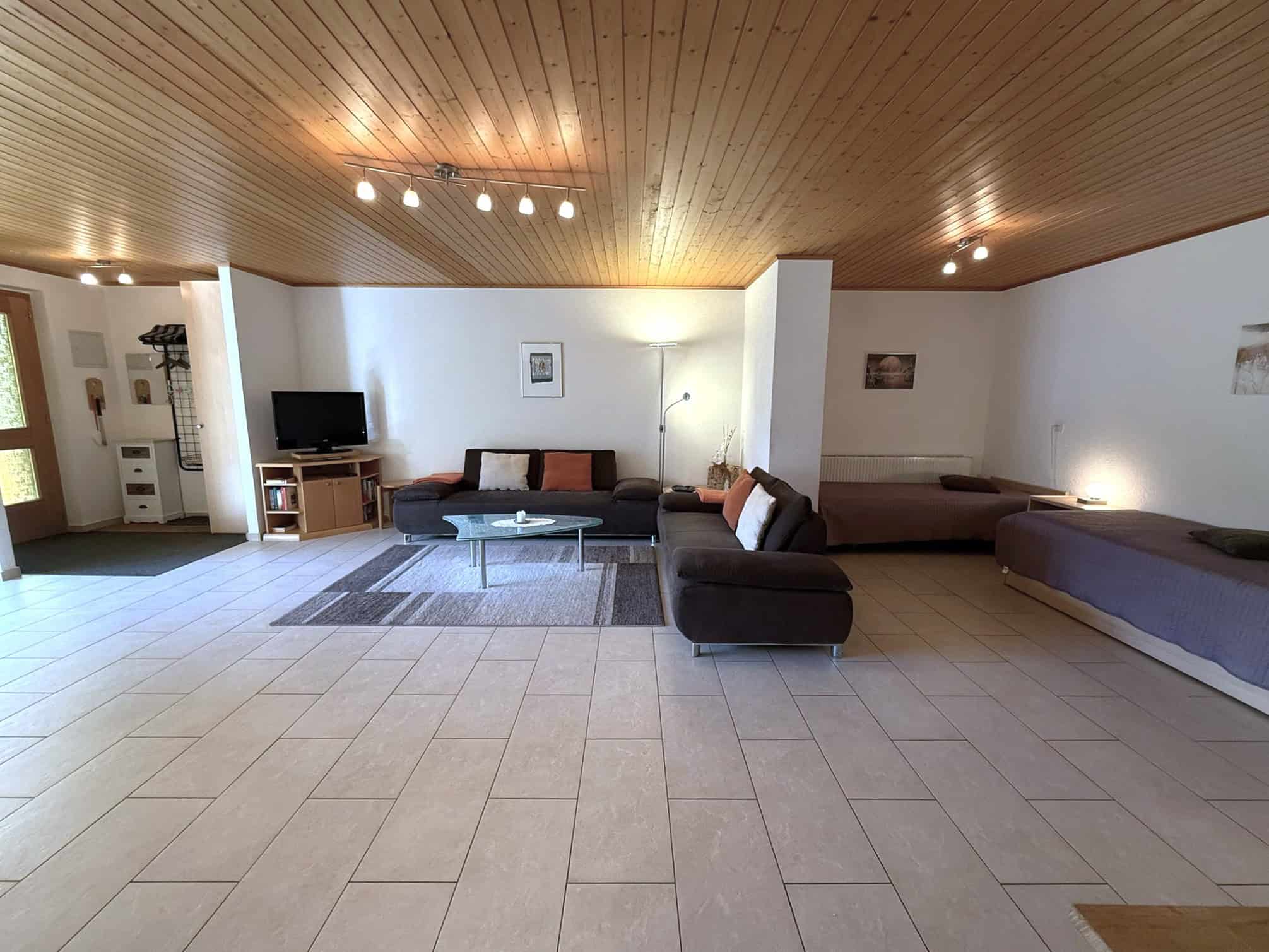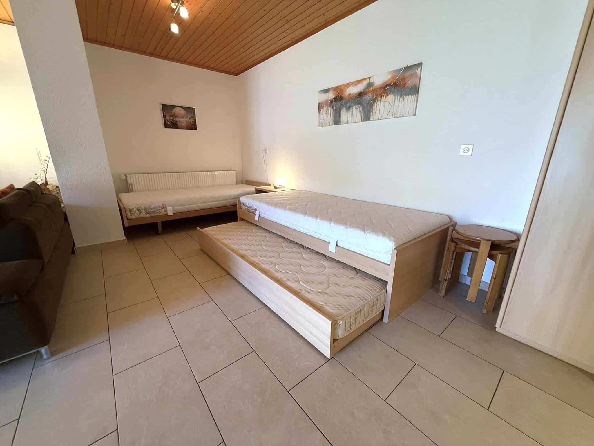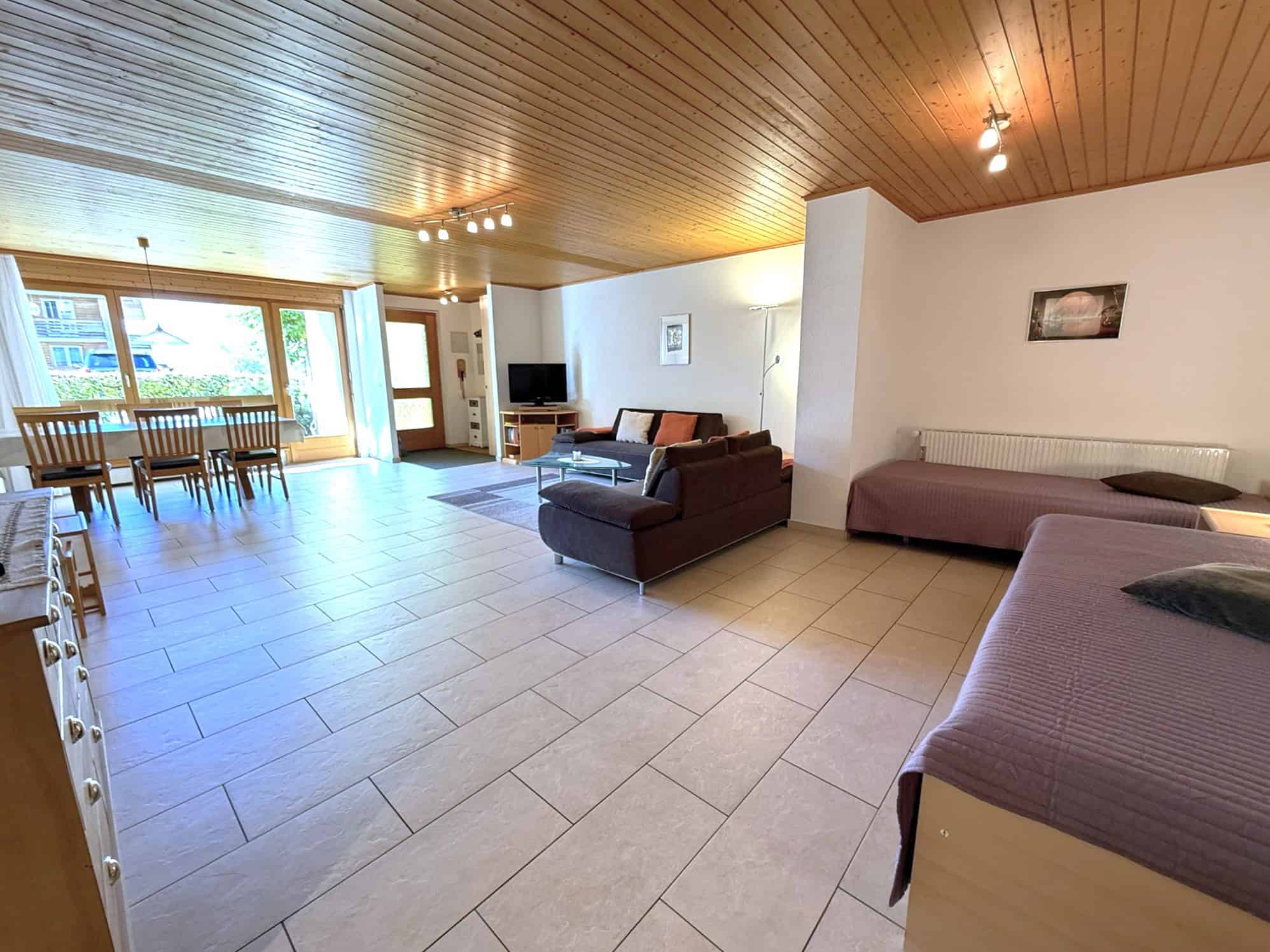 - Wohn- / Esszimmer mit grossen Sofas, drei Einzelbetten, Esstisch und Ausgang in Garten