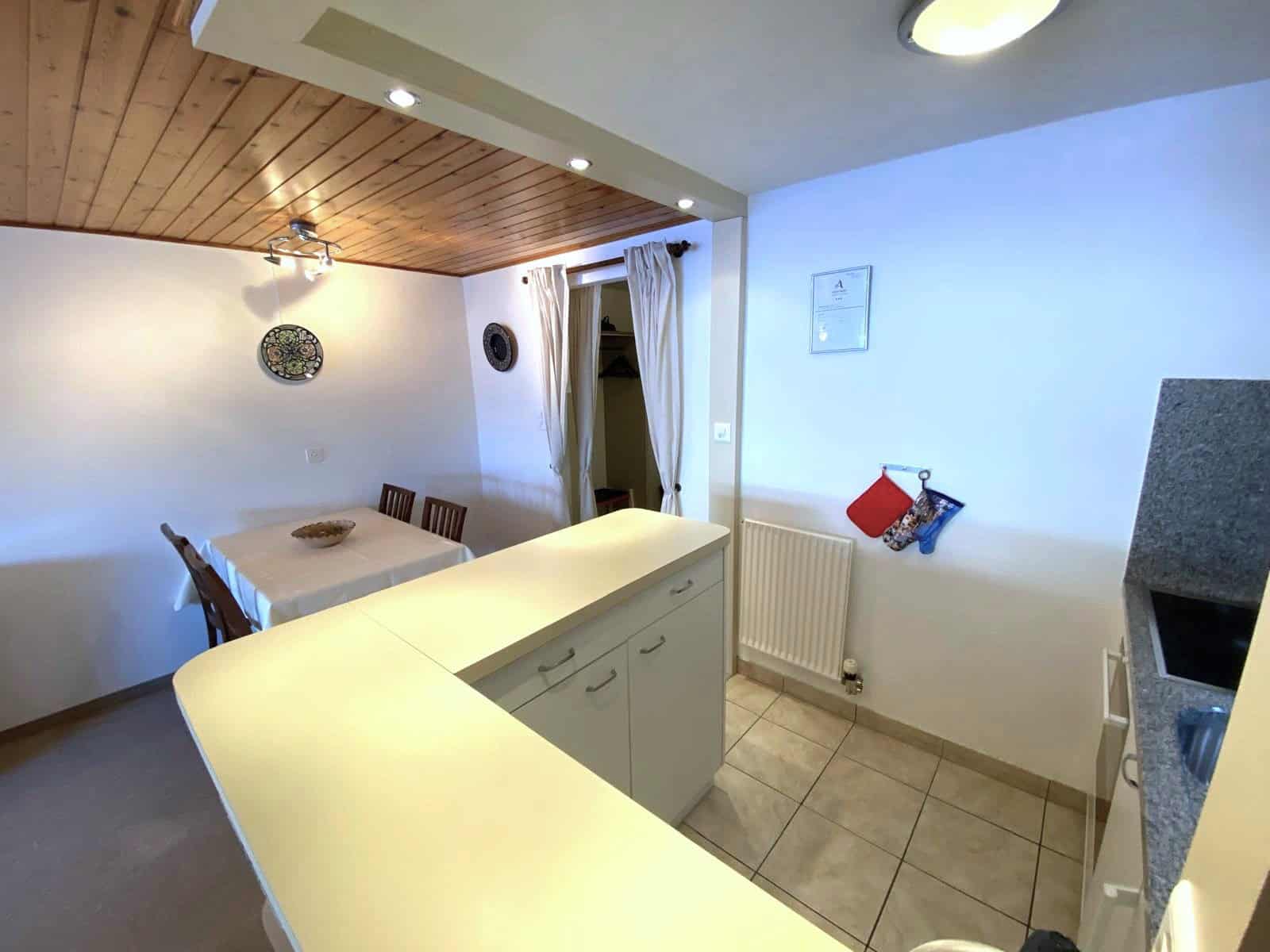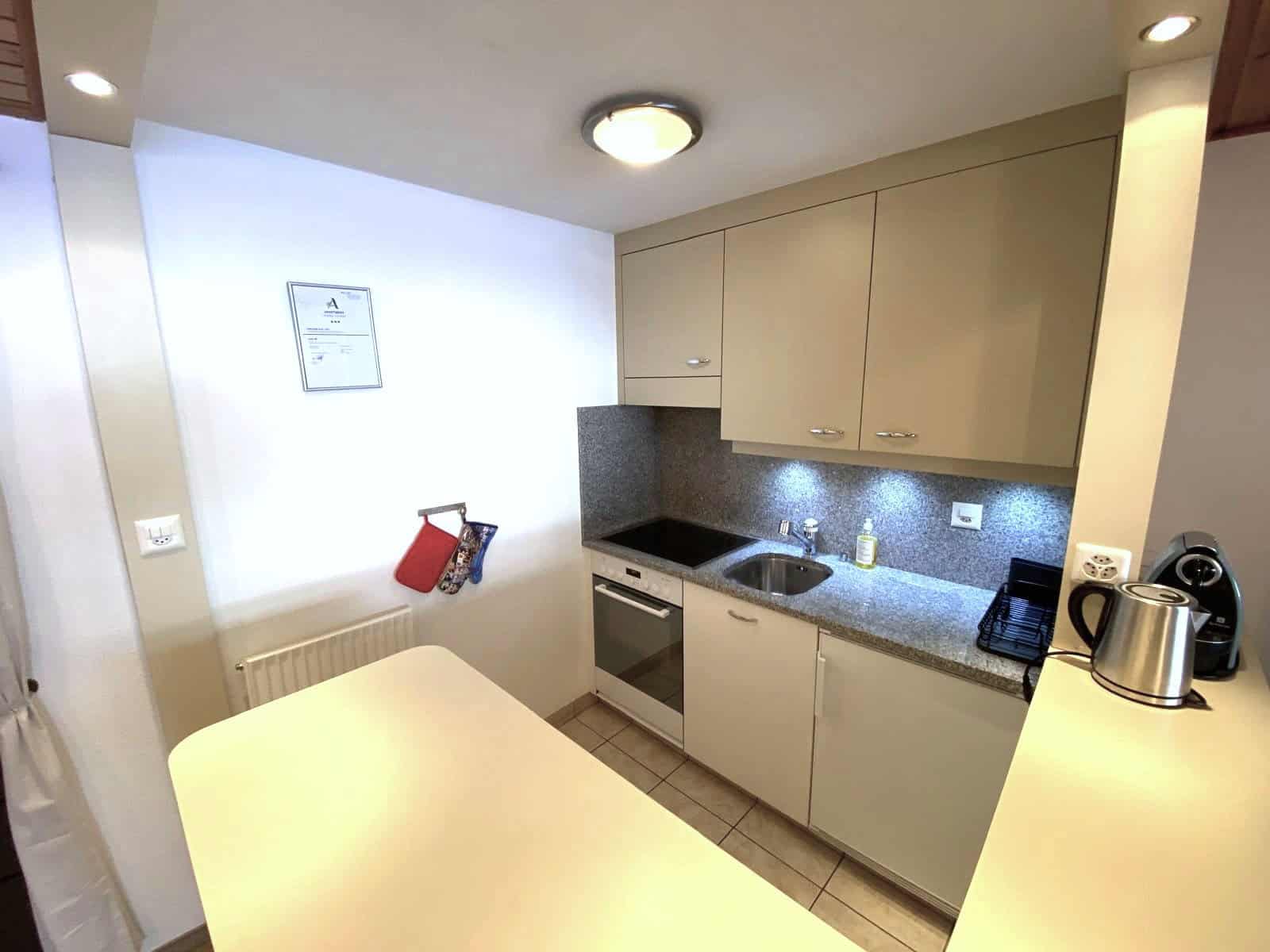 - Küche mit Backofen, Cerankochfeld, Kühlschrank mit Tiefkühlfach, Kaffeemaschine Nespresso, Wasserkocher, Raclette- und Fondueset