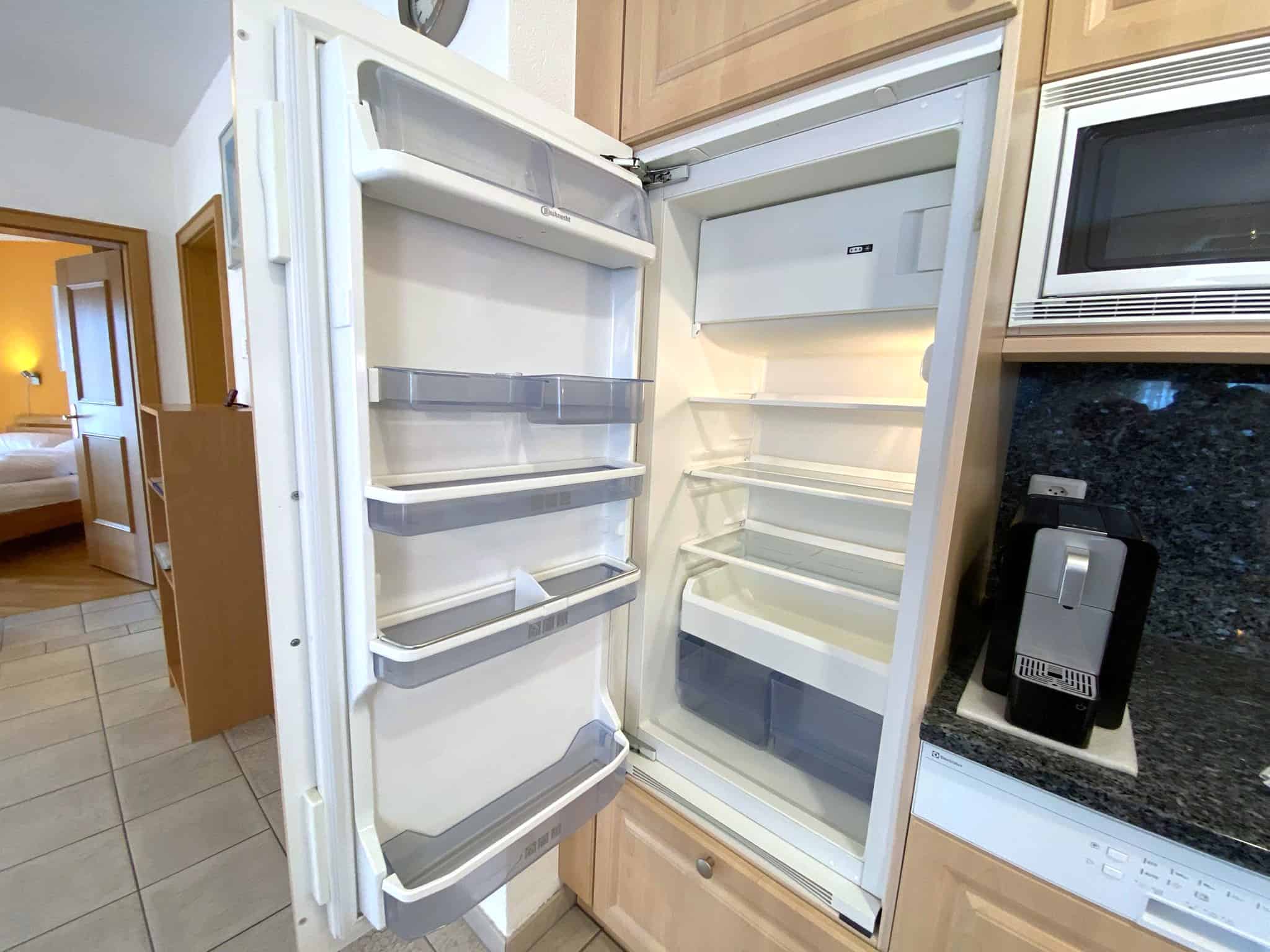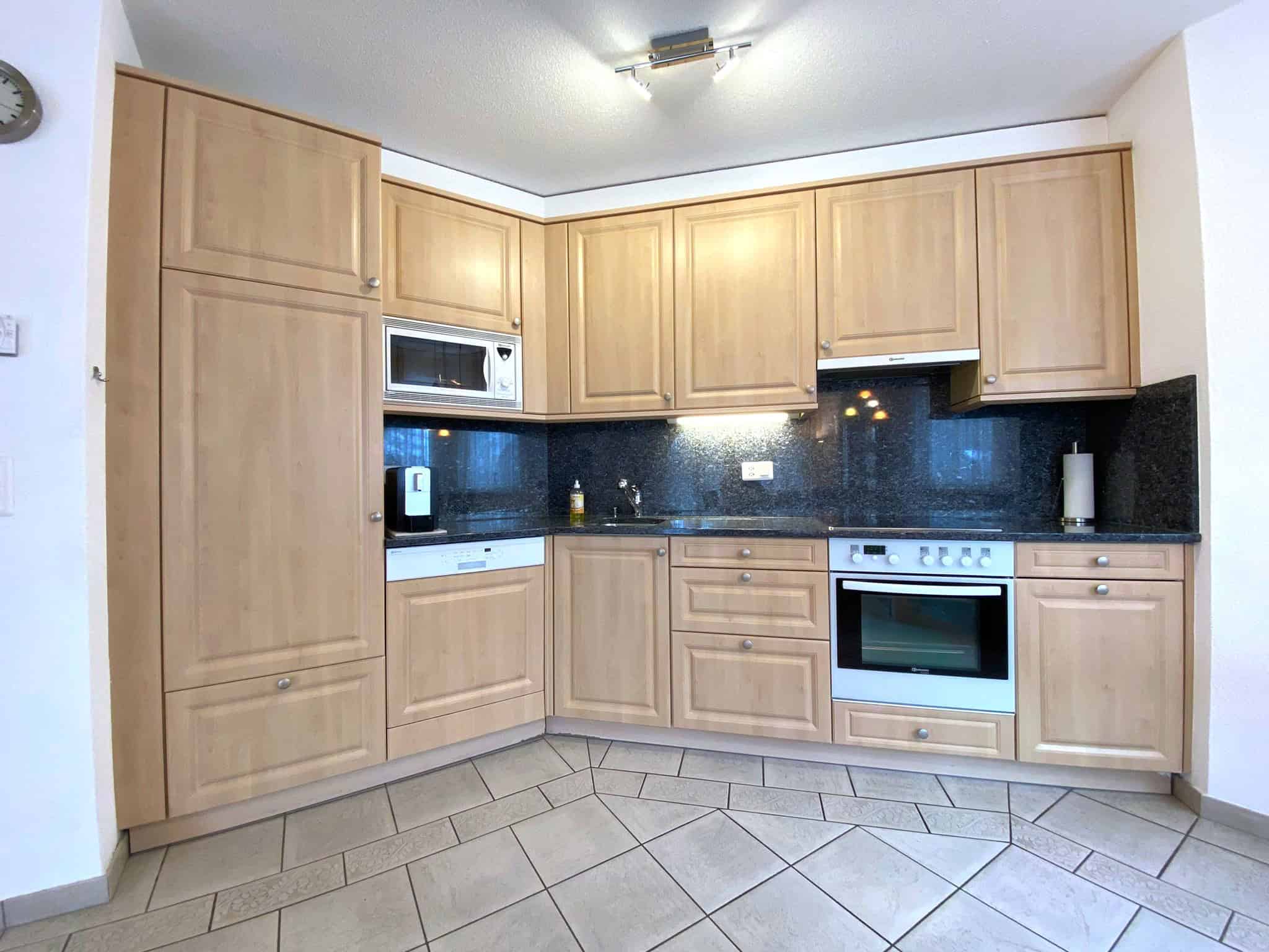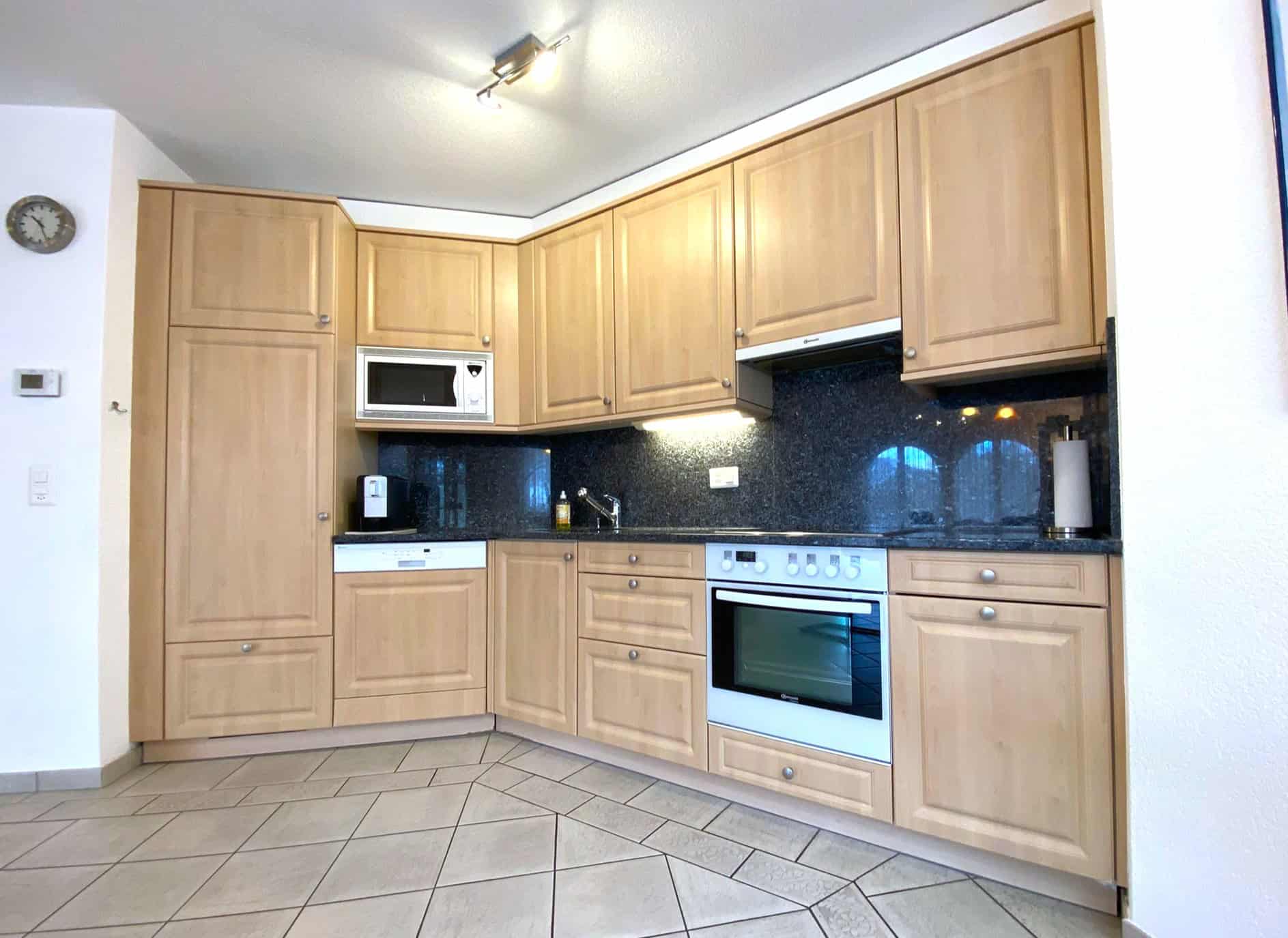 - Wohn- / Esszimmer mit offener Küche. Backofen, Cerankochfeld, Kühlschrank mit Tiefkühlfach, Kaffeemaschine, Wasserkocher, Geschirrspülmaschine